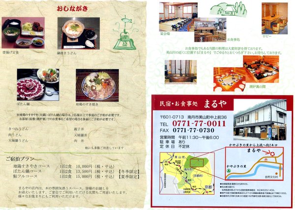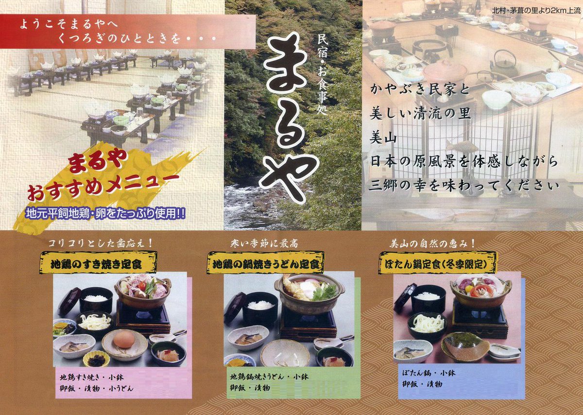 美山町かやぶきの里集落より1.2km上流にて民宿・お食事処として営業しております。由良川 上流の清流 美山川 のほとりに位置する まるや でごゆるりとおくつろぎ下さい。